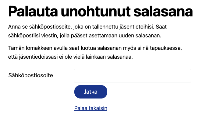 Sinulla on jo olemassa käyttäjätunnus, joka on sama kuin jäsenrekisterin sähköpostiosoite. Ota se käyttöön luomalla sille salasana.